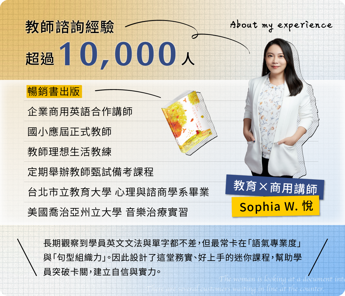 累積超過 10 年英語教學經驗,幫助100+教師通過多益、托福、英檢和教師甄試