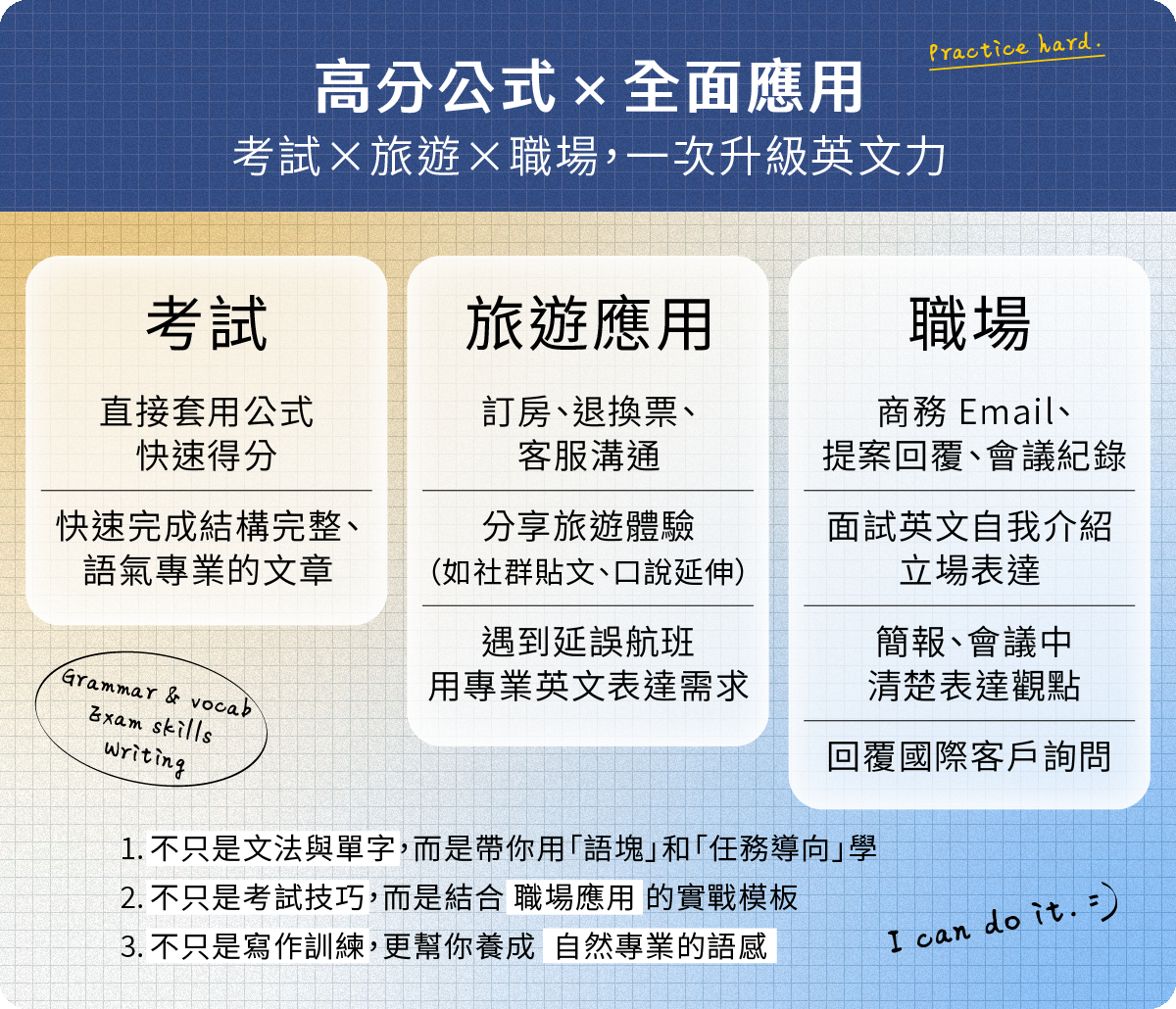系統化架構與心理策略,從考場到職場都能自信表達,憑藉心理諮商的學歷背景,發現考生在學習上的需求,用最有效率的方式,提升考生英文力!