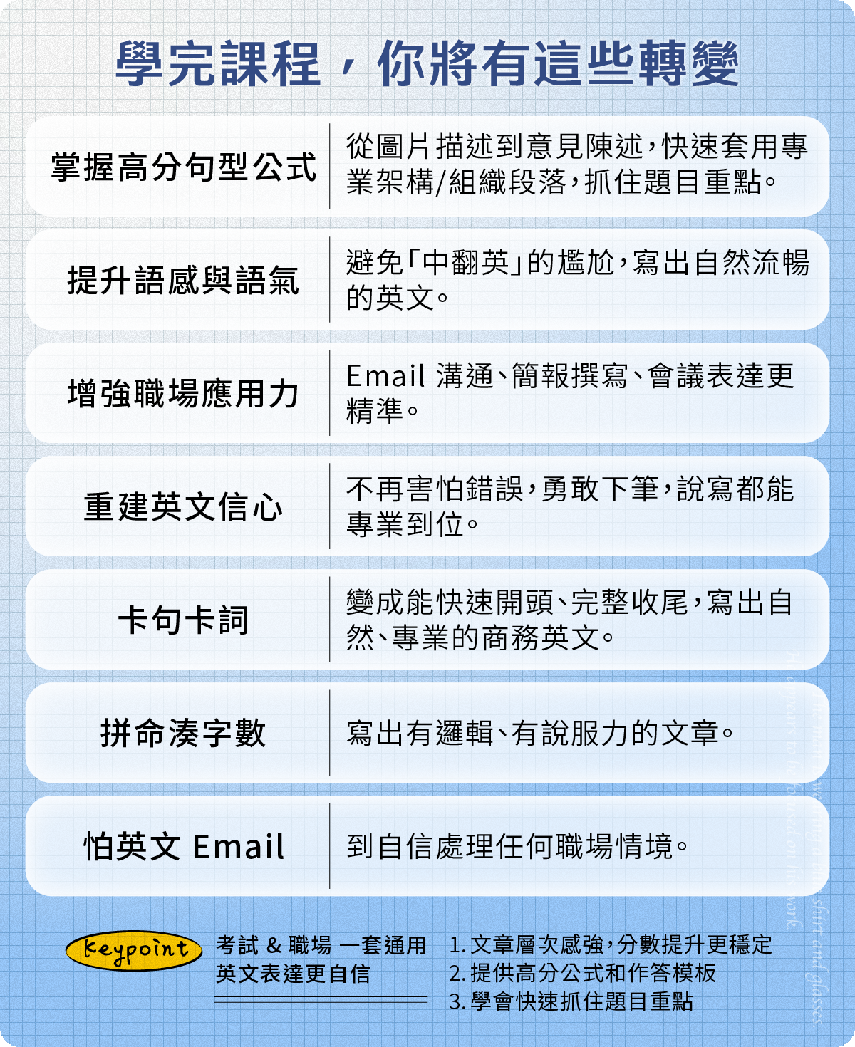 系統化架構與心理策略,從考場到職場都能自信表達,憑藉心理諮商的學歷背景,發現考生在學習上的需求,用最有效率的方式,提升考生英文力!